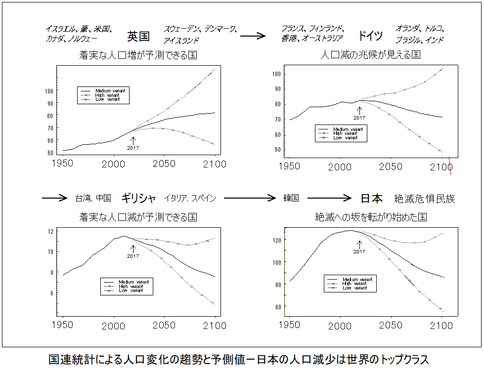 「人口減の坂を転がり始めた国」と、世界の国々を4つのグループに分けて報告しています。