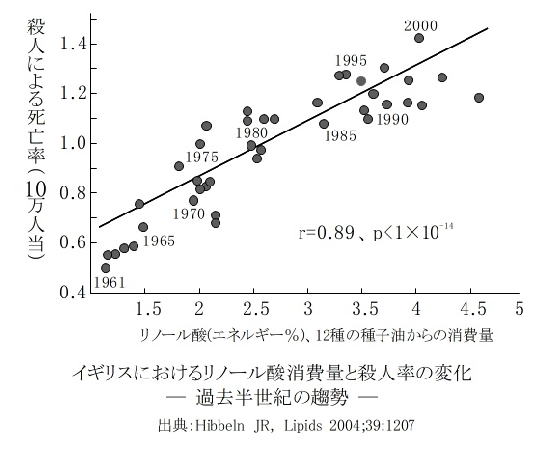英国では、すでに1960年以降、リノール酸摂取量の増加とともに、殺人率が増えています。
