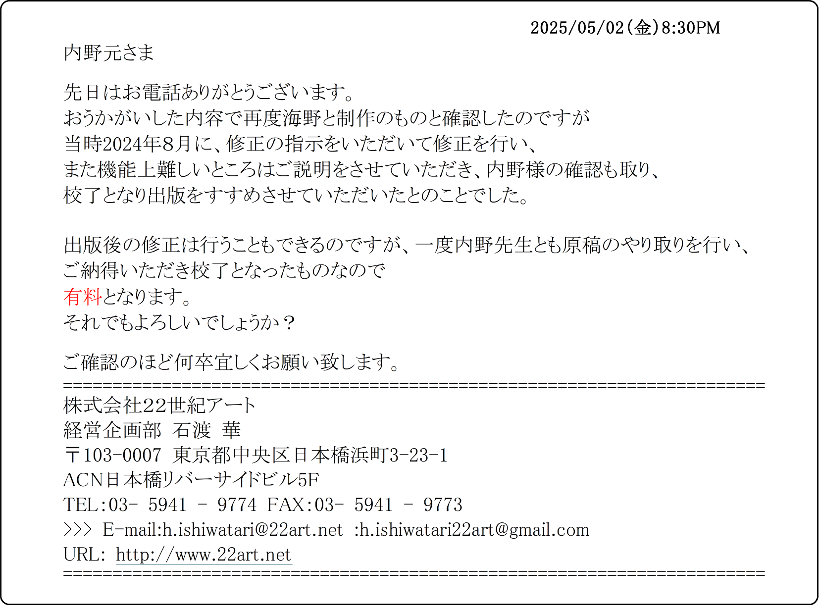 ここに上げたメールは22世記アートからのメール(2025年05月15日)であって、